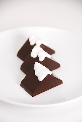- Hand-crafted, pyramid-shaped truffles, some topped with white chocolate snowy peaks.